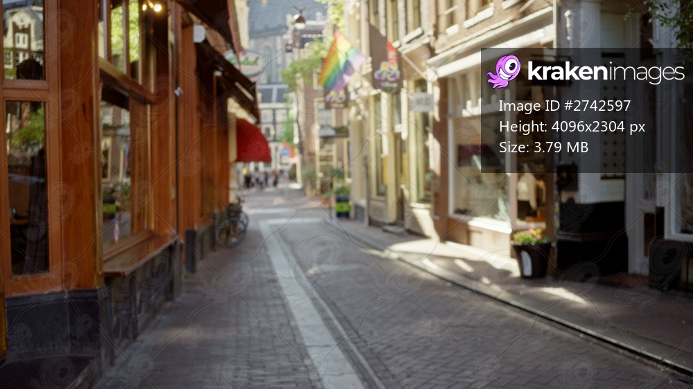 Blurred view of a charming european street with defocused shops and colorful flags in a quaint, sunlit urban town setting, inviting exploration and discovery.