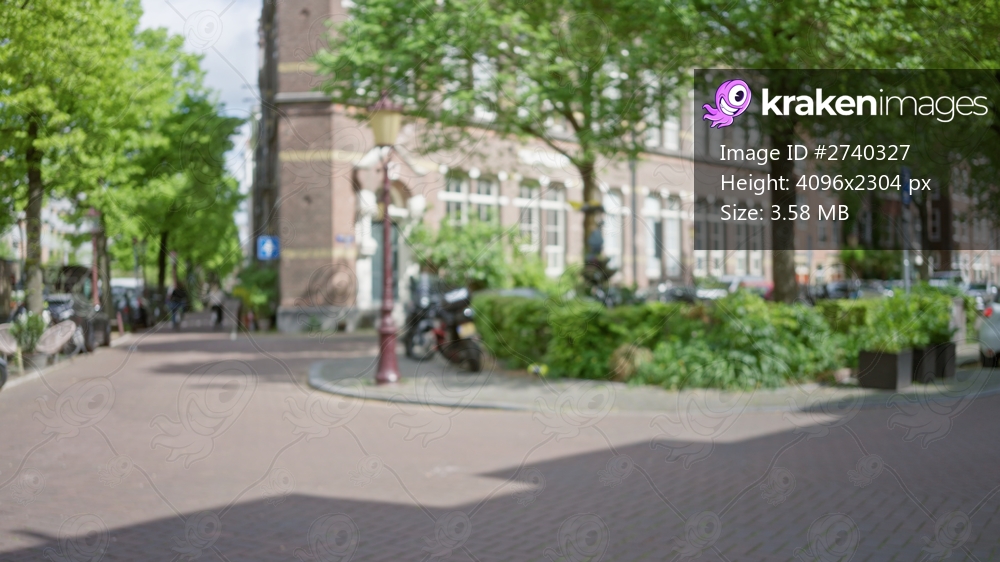 Blurred view of a european city street with cobblestones, green trees, historic architecture, a defocused man, and vintage lamp post creating a serene outdoor urban scene. - Kraken Images