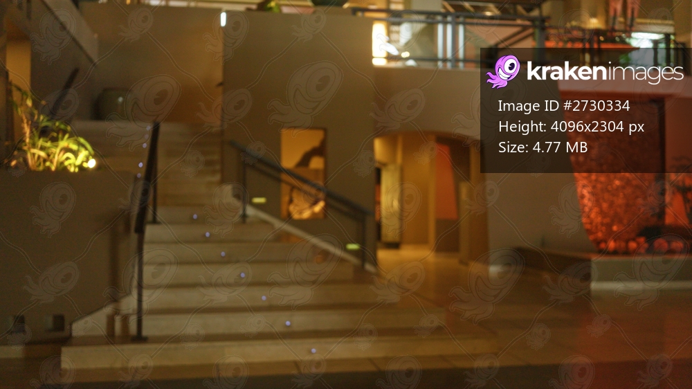 Blurred view of a luxurious hotel lobby with elegant stairs and warm lighting, creating an inviting atmosphere.