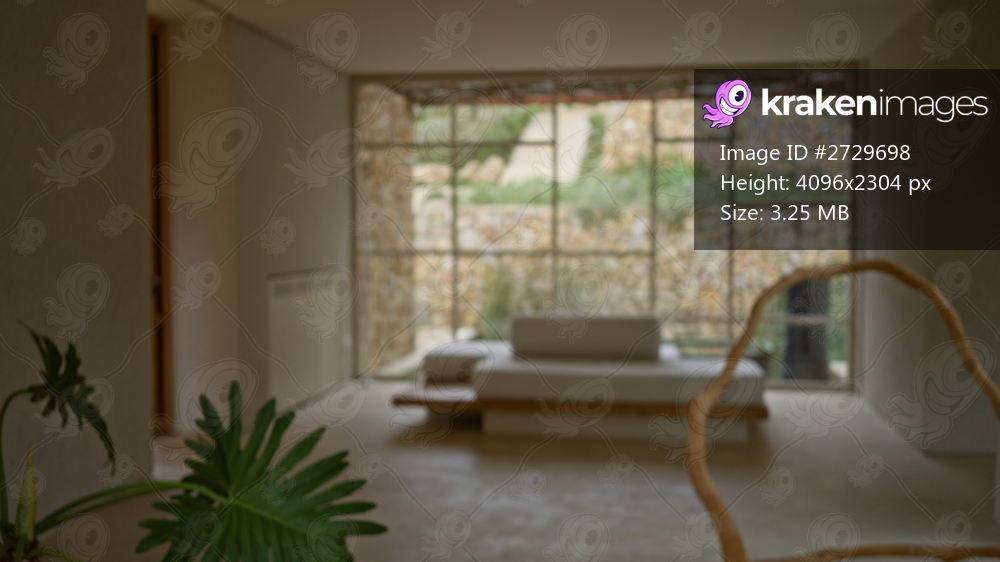 Blurred view of a luxury mediterranean indoor space with a defocused couch set against a backdrop of natural stone and lush greenery, embodying elegance and style. - Kraken Images