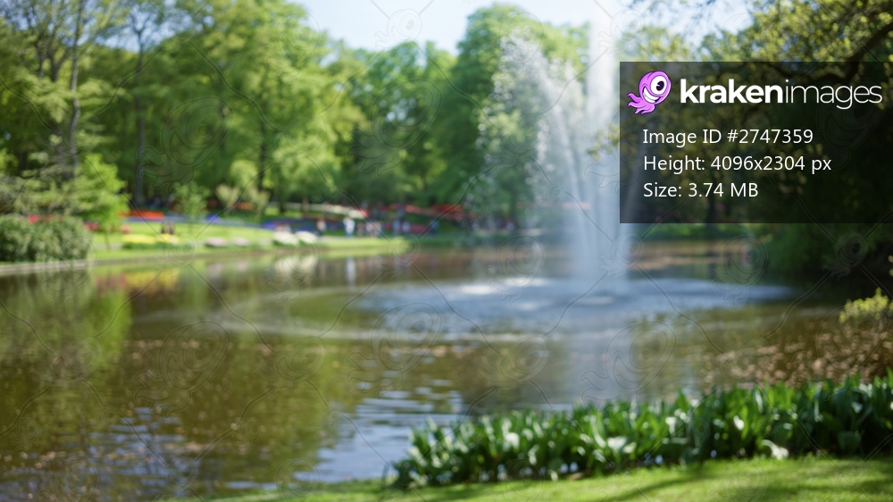 Blurred view of a serene park with a central water fountain surrounded by lush greenery and colorful flowers representing bokeh photography and tranquility in nature. - Kraken Images