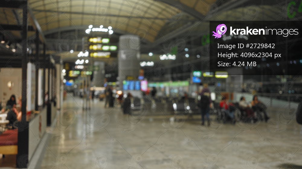Blurred view of airport terminal with people, seating area, and high ceilings showcasing a bustling travel hub atmosphere.