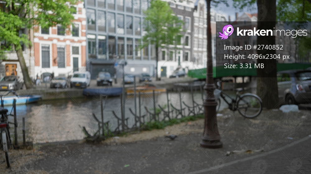 Blurred view of amsterdam canal with bicycles parked along the waterfront, capturing the essence of urban netherlands through defocused architecture and cityscape. - Kraken Images