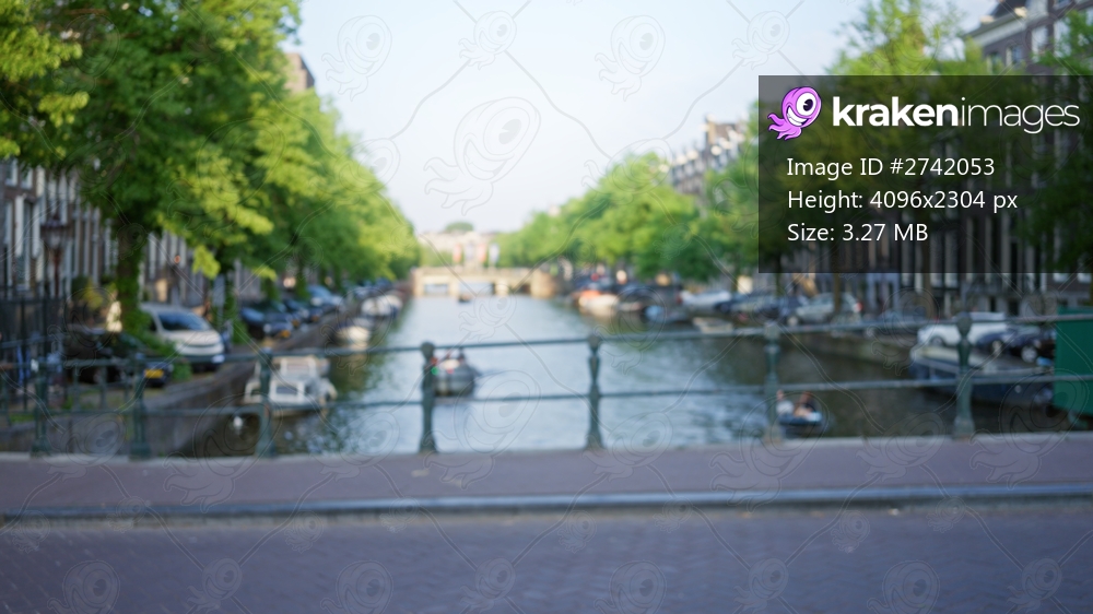 Blurred view of amsterdam canal with boats and green trees creating a defocused background of urban scenery in the netherlands during a sunny day.