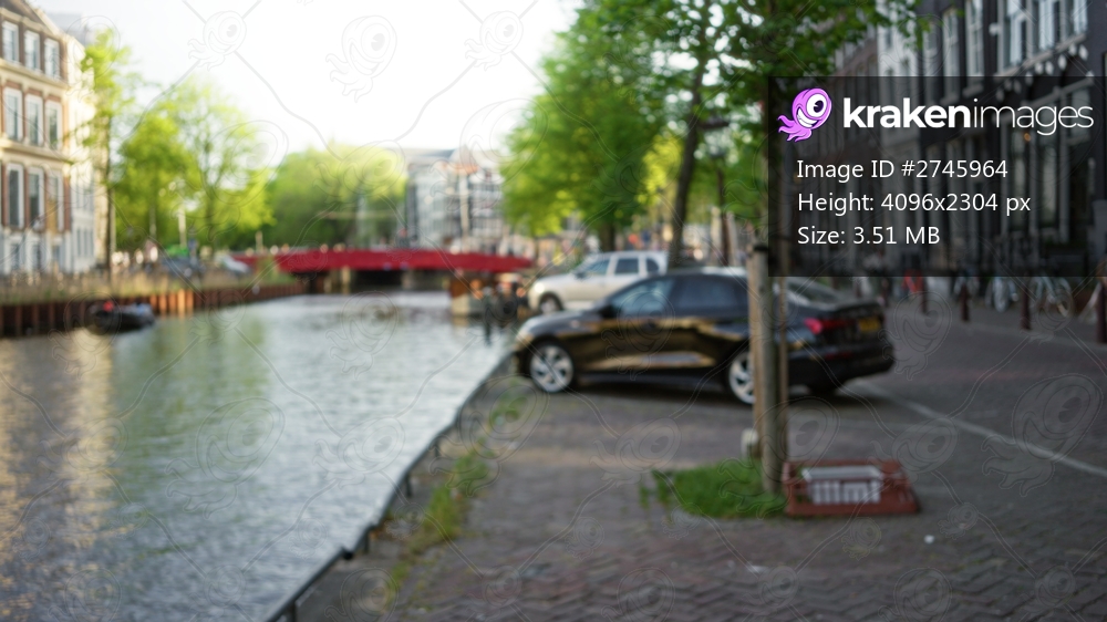 Blurred view of amsterdam canal with cars parked along the water and trees lining the walkway under a clear sky.