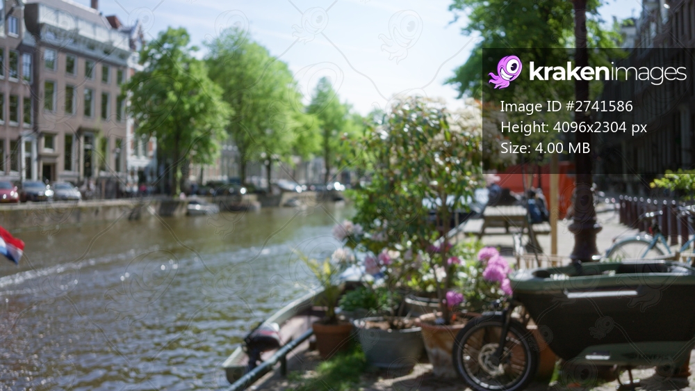 Blurred view of amsterdam canal scene with bicycles, vibrant spring flowers and distinctive dutch architecture, showcasing serene urban life under clear skies. - Kraken Images