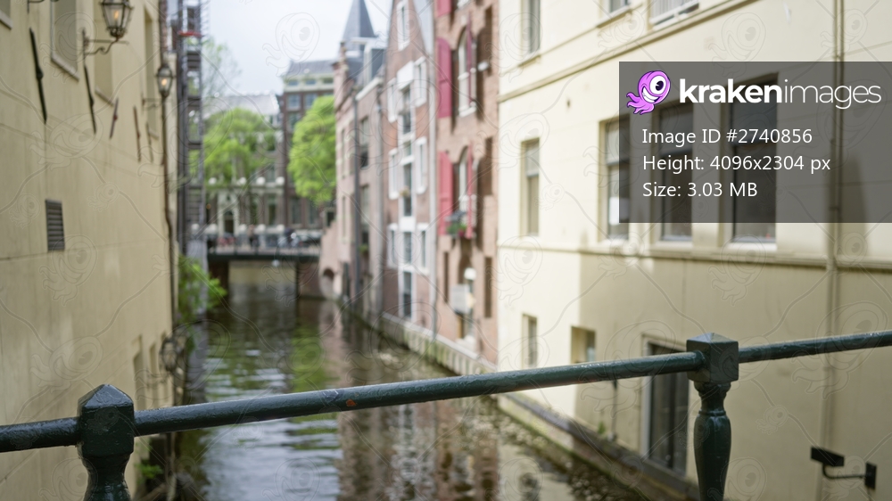 Blurred view of amsterdam canal showing historic buildings and a bridge with defocused bokeh effect under sunny skies.
