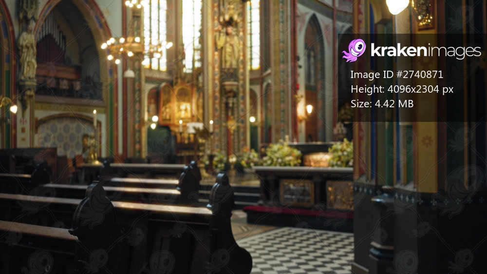 Blurred view of an ornate catholic church interior with colorful details, defocused pews, and bokeh lighting creating a serene sacred atmosphere indoors. - Kraken Images