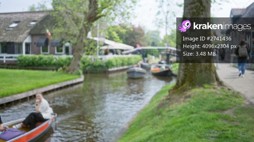 Blurred view of giethoorn canal with woman in boat, trees, houses, and a footbridge creating a peaceful netherlands village scene.