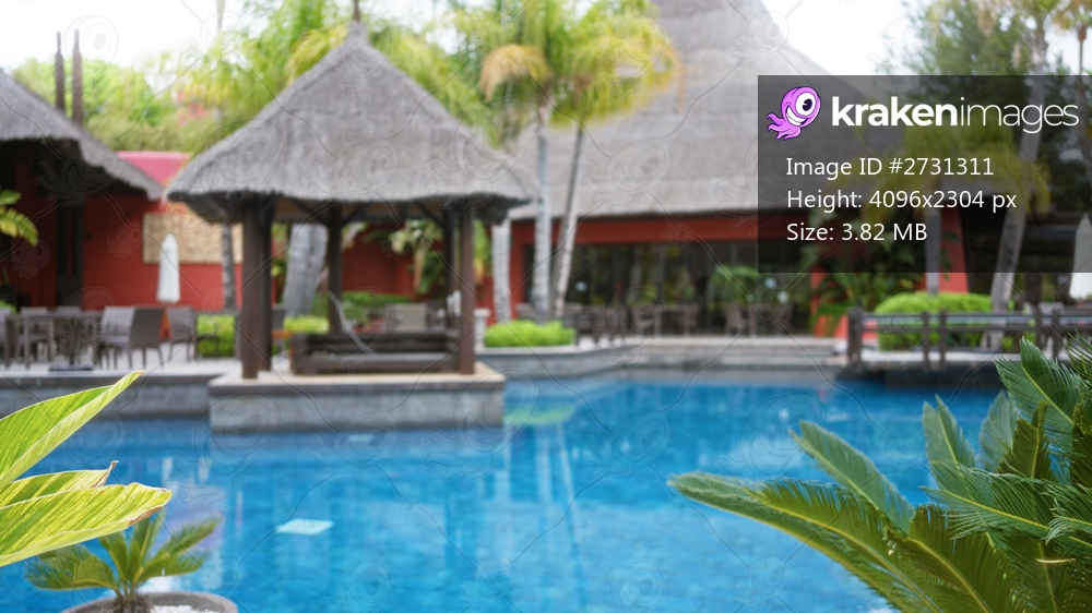 Blurred view of luxury tropical resort with pool, thatched huts, and palm trees under blue sky, conveying a serene and relaxing outdoor ambiance.