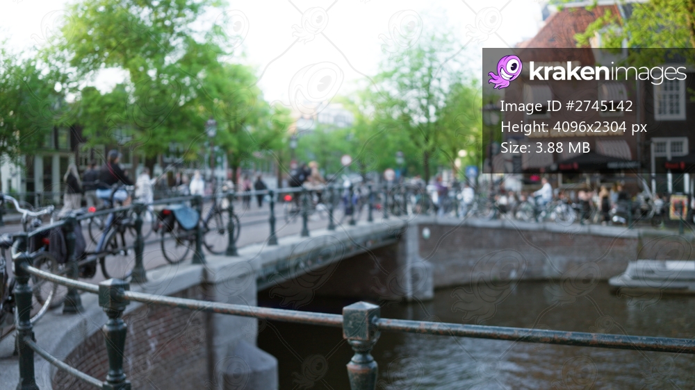 Blurred view of people and bicycles on a bridge over a canal in amsterdam, netherlands, with trees and a brick building in the background, creating an urban bokeh effect. - Kraken Images