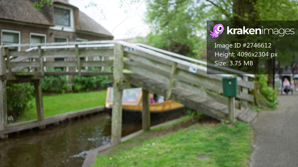 Blurred view of wooden bridge over canal in giethoorn with boat beneath amid green trees and people strolling in defocused background in charming dutch village setting. - Kraken Images