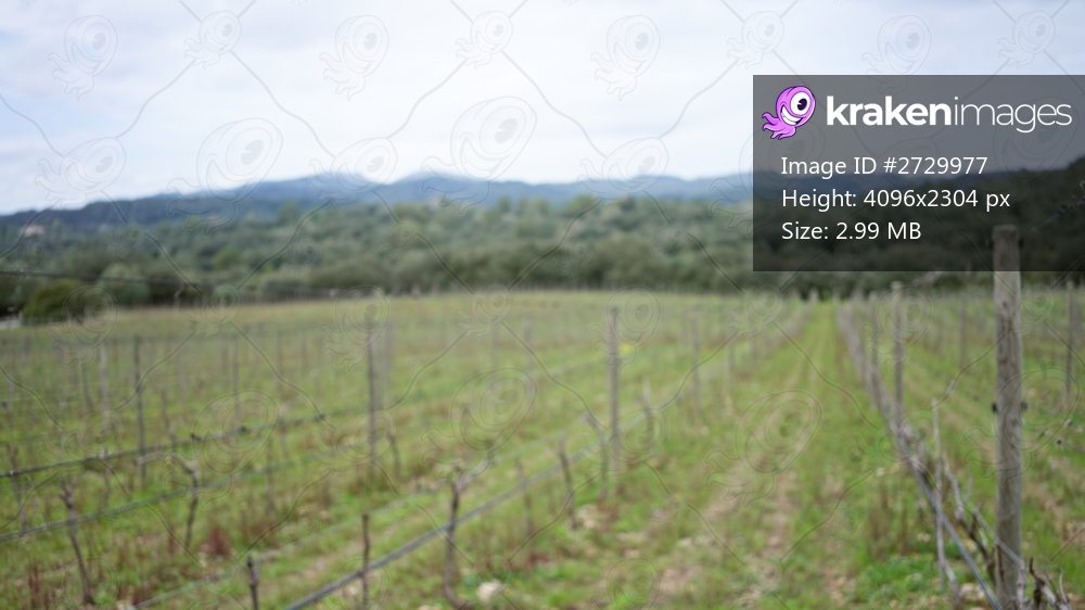 Blurred vineyard scene with lush greenery and defocused background, capturing the essence of mediterranean fields on a sunny day.