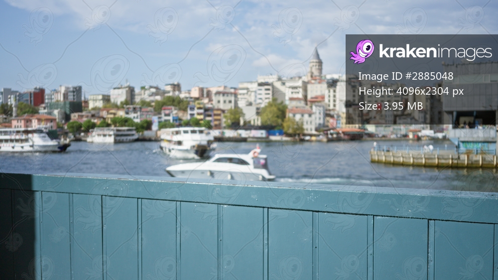 Blurred waterfront scene with shallow bokeh and defocused city skyline, soft teal railing in foreground city; background backdrop copyspace calm.