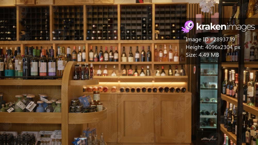Blurred wine shop with shallow focus on wooden shelves and bottles, warm soft bokeh and retail shelving depth; background backdrop copyspace calm.