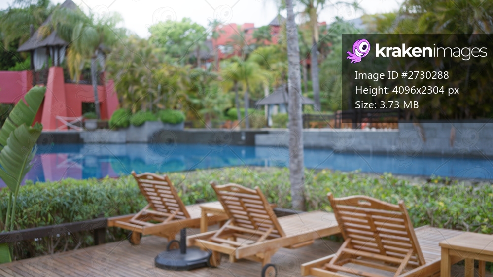 Blurred wooden loungers by a pool in a tropical luxury resort exhibiting defocused bokeh background with palm trees and colorful architecture under an overcast sky - Kraken Images