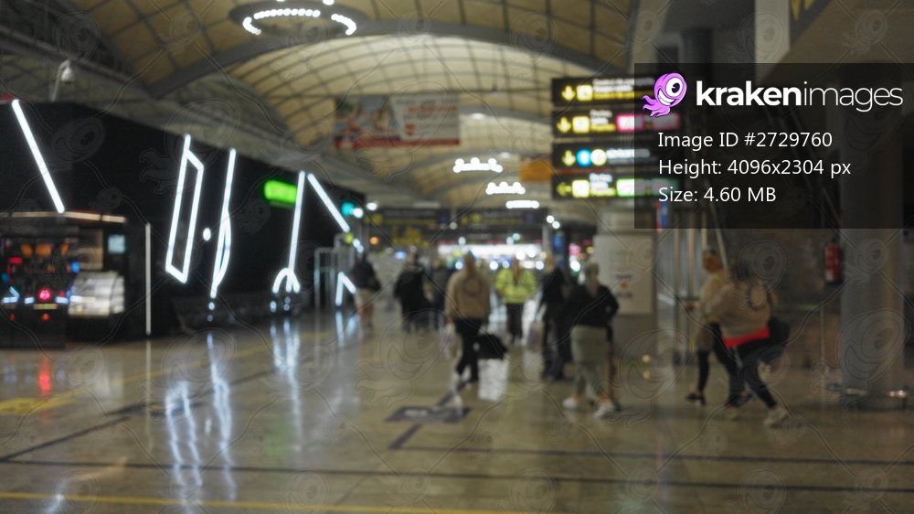 Blurry airport terminal scene with people walking under bright signs surrounded by expansive architecture, capturing a bustling travel atmosphere in an indoor setting. - Kraken Images