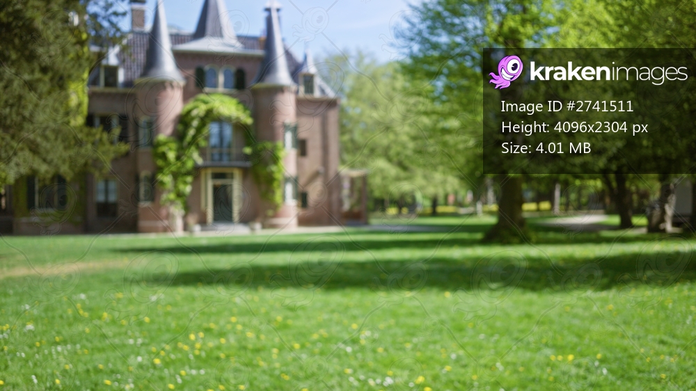 Blurry garden scene with defocused view of historic castle surrounded by lush greenery and bright sunlight, creating a serene and peaceful atmosphere.