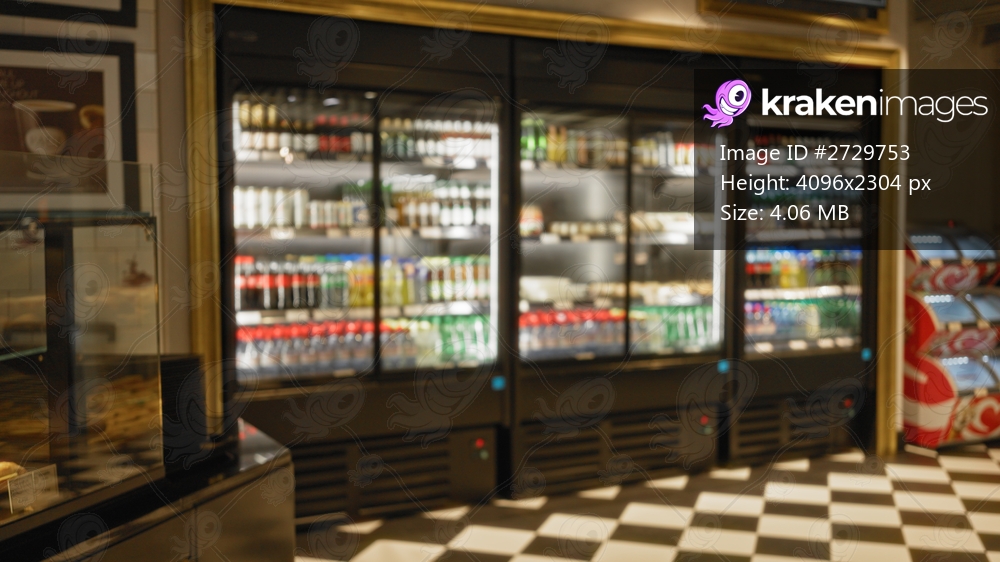 Blurry grocery store interior with beverage fridges and soft lighting creating a defocused bokeh effect, showcasing a wide selection of drinks against a tiled floor. - Kraken Images