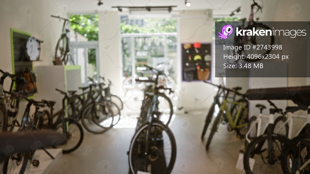 Blurry image of a bike shop interior with various bicycles on display, featuring a bright bokeh effect and defocused background, illuminating the modern retail space. - Kraken Images