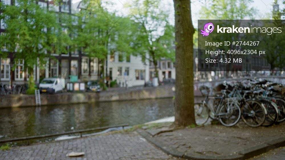 Blurry scene showcasing a bokeh view of trees, bikes, and amsterdam canals, highlighting outdoor tranquility along dutch waterways under lush foliage.