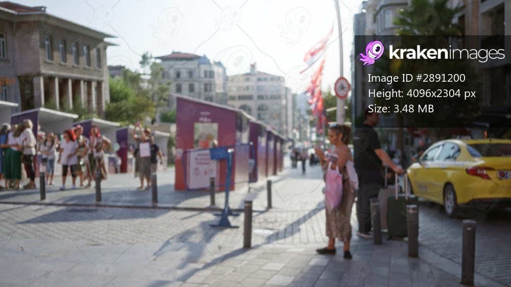 Blurry sunlit city street scene with soft bokeh and defocused foreground, market stalls and taxis street; background backdrop copyspace calm.