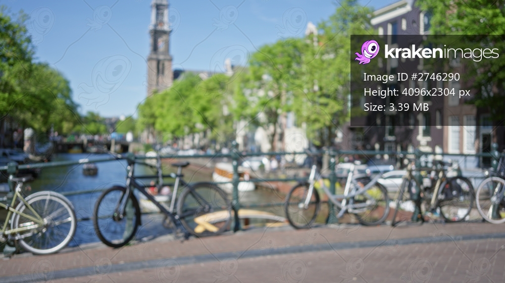 Blurry view of bicycles resting on a canal bridge in amsterdam, netherlands, with buildings and trees softly out of focus in the bright sunlight, creating a dreamy bokeh effect. - Kraken Images