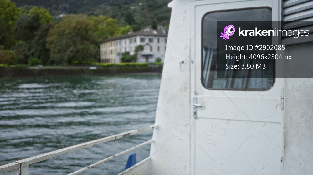 Boat deck and cabin door in sharp foreground with blurred lakeside villa, rippled water and trees in soft bokeh outdoor; background backplate copyspace calm. - Kraken Images