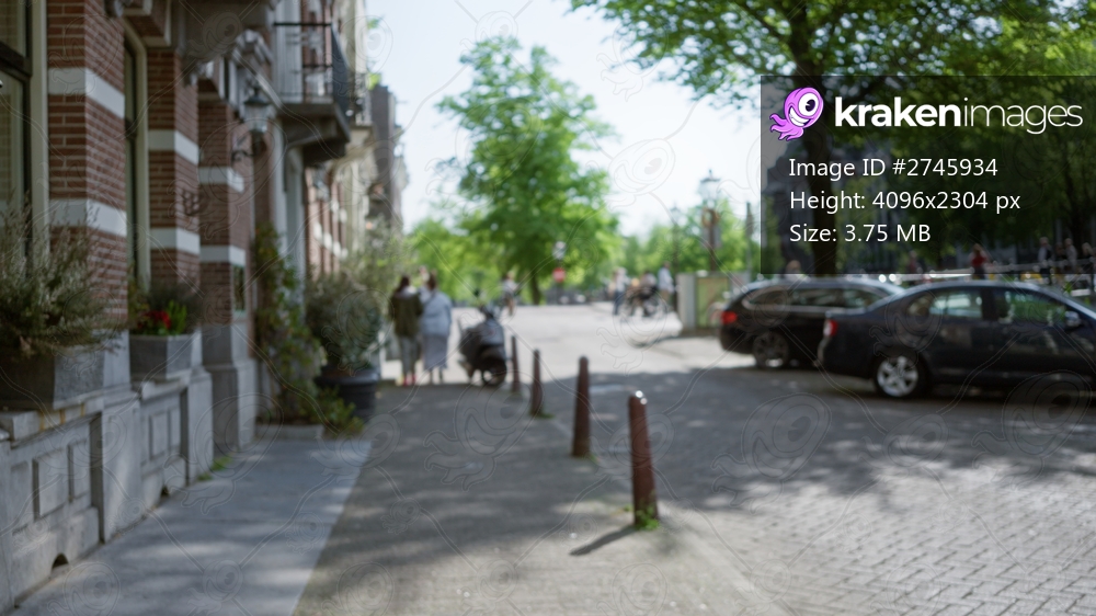 Bokeh view of european city street with people talking near parked cars on a sunny day, featuring blurred surroundings, trees, and urban architecture.