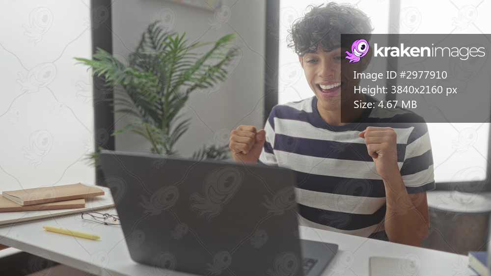 Boy at desk raises clenched fists in celebration while watching a laptop screen in a tidy office with books and plant; achievement joy.