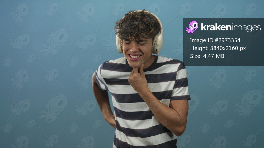 Boy with headphones and striped shirt holding hand to throat, grimacing and tilting head in studio; vocal strain pain.