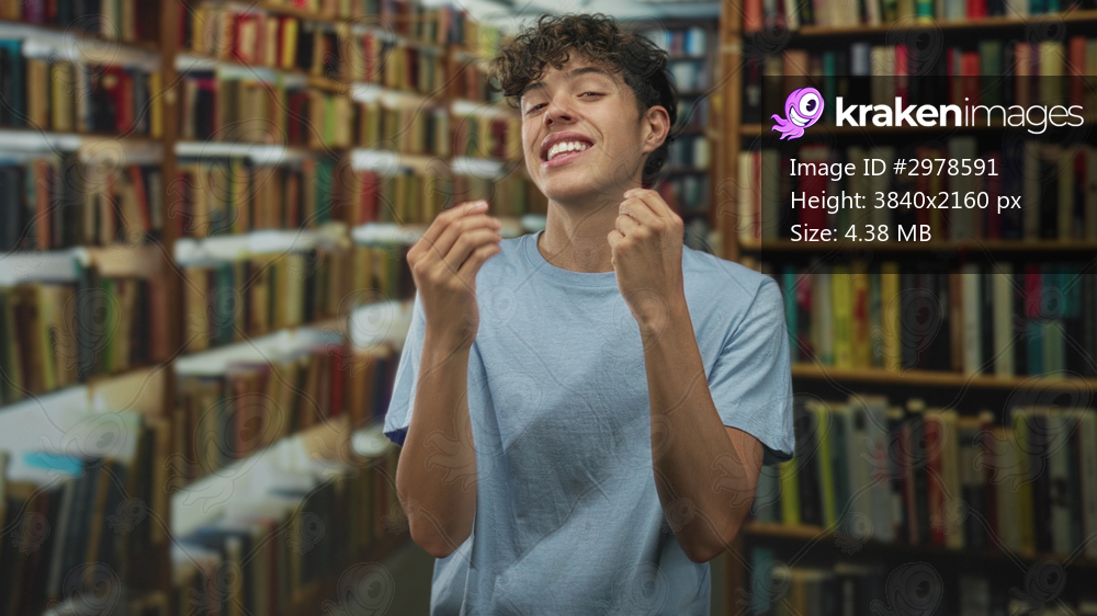 Boy in blue shirt pinches fingers with hands, grinning and making a money gesture surrounded by tall bookshelves in a building library aisle; playful joy. - Kraken Images