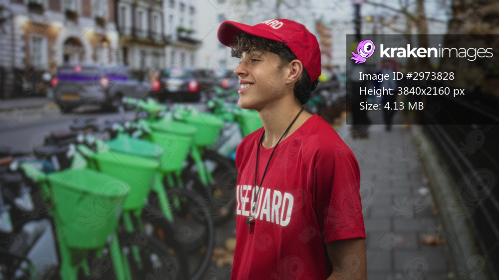 Boy in red lifeguard shirt smiling with whistle on crowded city street by parked bikes; calm duty youth.