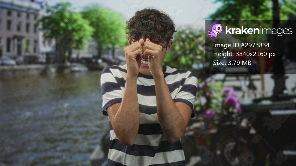 Boy rubbing and covering eyes with hands on a canal street in city beside flowers and a bike, wearing striped shirt; tiredness reflection.