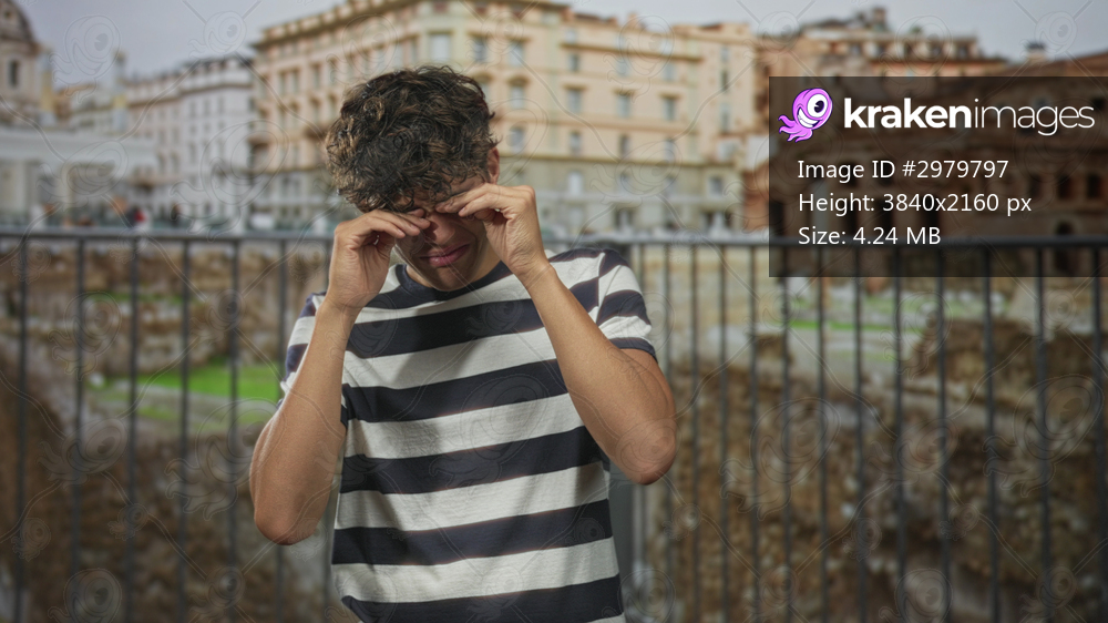Boy rubbing eyes with both hands at a building side ruins railing, wearing a striped shirt and squinting in bright sunlight; tiredness.