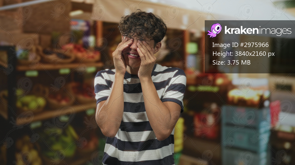 Boy rubbing face with hands in a striped shirt amid a street market stall of fruit and crates; fatigue errand.