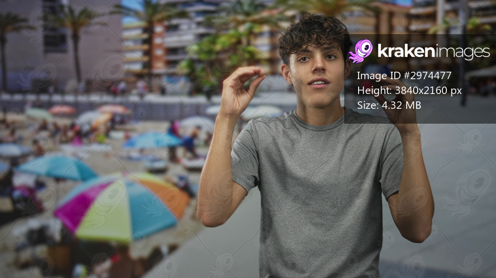 Boy showing pinching hand gesture on a crowded beach promenade with umbrellas and palm trees; curiosity summer.