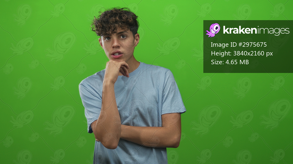 Boy shrugging with hands in studio against green screen, wearing light blue tshirt and palms up; uncertainty communication.