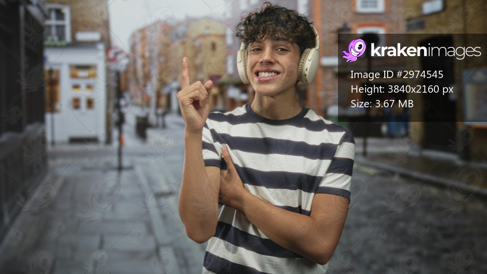 Boy wearing headphones pointing index finger on a wet cobblestone street in front of brick buildings, smiling in a striped t shirt; youthful joy.