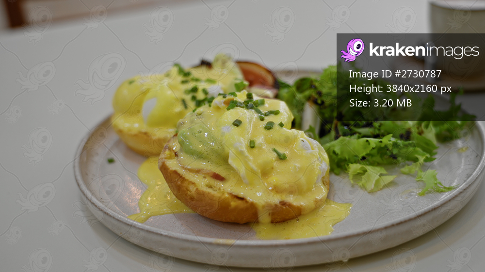 Brunch scene featuring eggs benedict with lush salad on a plate indoors at a restaurant highlighting fresh chives and creamy hollandaise sauce.