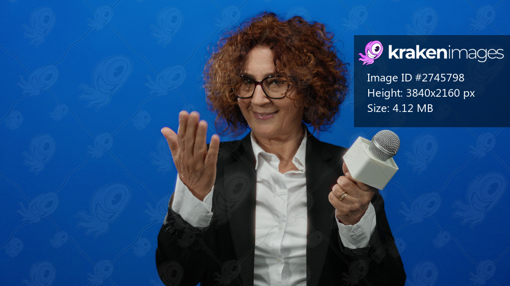 Brunette hispanic woman in a suit gestures with microphone excitedly against a blue background, highlighting her role as a reporter in an isolated setting. - Kraken Images