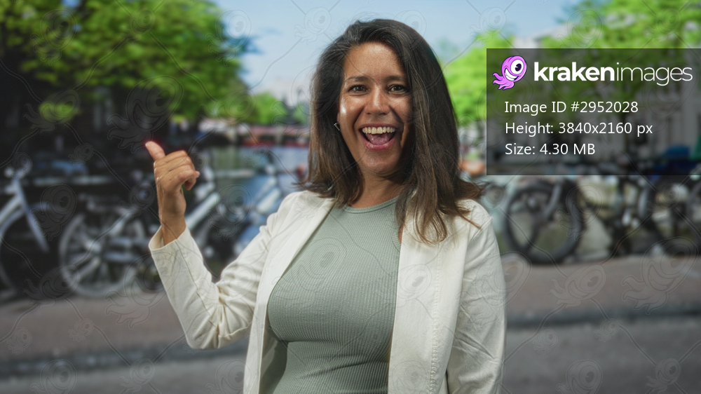 Brunette middle age woman smiling and giving a thumbs up while pointing at parked bicycles on a street lined with trees; confidence travel.