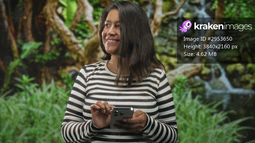Brunette middle aged woman holds smartphone in both hands and smiles while typing, standing before trees and waterfall in a forest; quiet contentment.