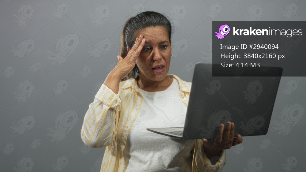 Brunette middleaged woman holds laptop with one hand, presses hand to forehead and looks at screen in studio; frustration concern.