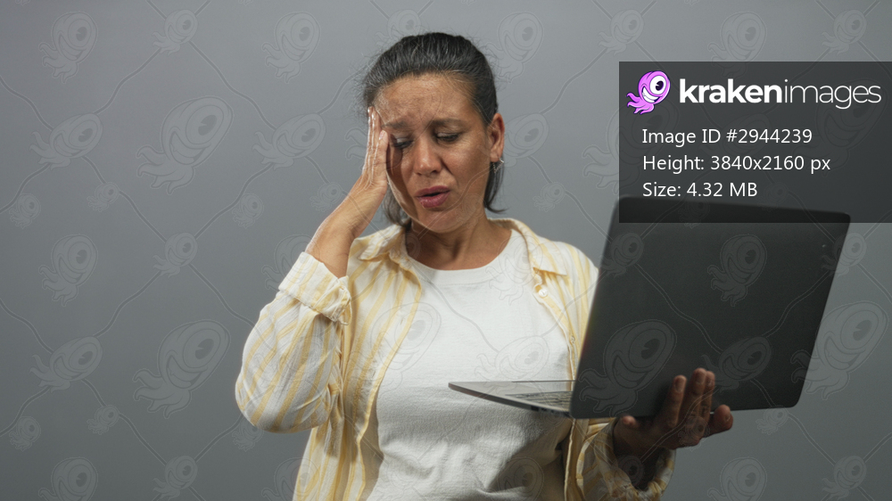Brunette middleaged woman holds laptop with one hand, presses hand to forehead and looks at screen in studio; frustration concern.