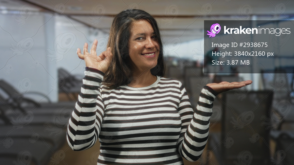 Brunette middleaged woman in striped top shows ok sign with hand and presents palm up at airport gate while smiling; cheerful approval.
