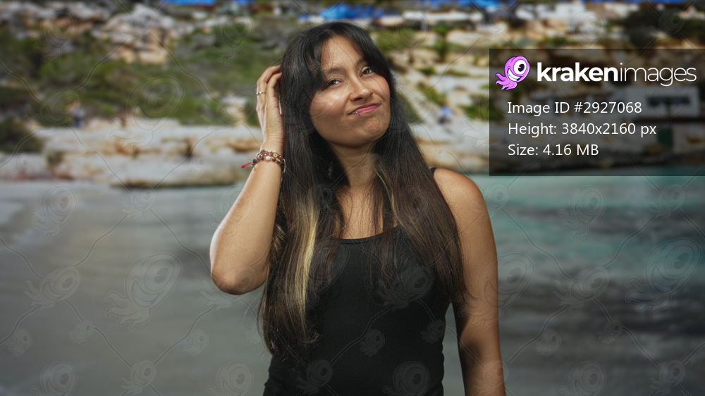 Brunette woman covers mouth with hand and yawns on a sunny rocky beach at seaside; vacation rest sleepy.