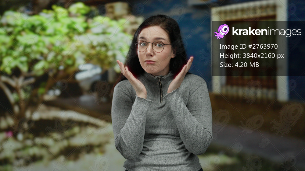 Brunette woman expressing various emotions on a street outdoors wearing glasses with a curious and thoughtful look against a blurred urban background with green foliage. - Kraken Images