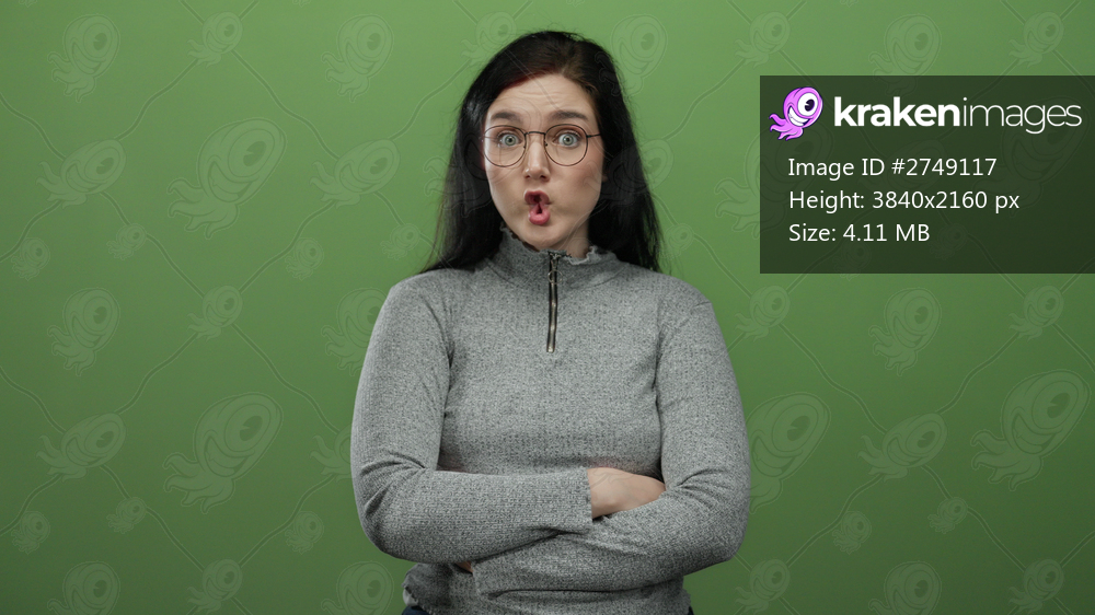 Brunette woman with glasses pouting playfully against green background arms crossed wearing grey sweater