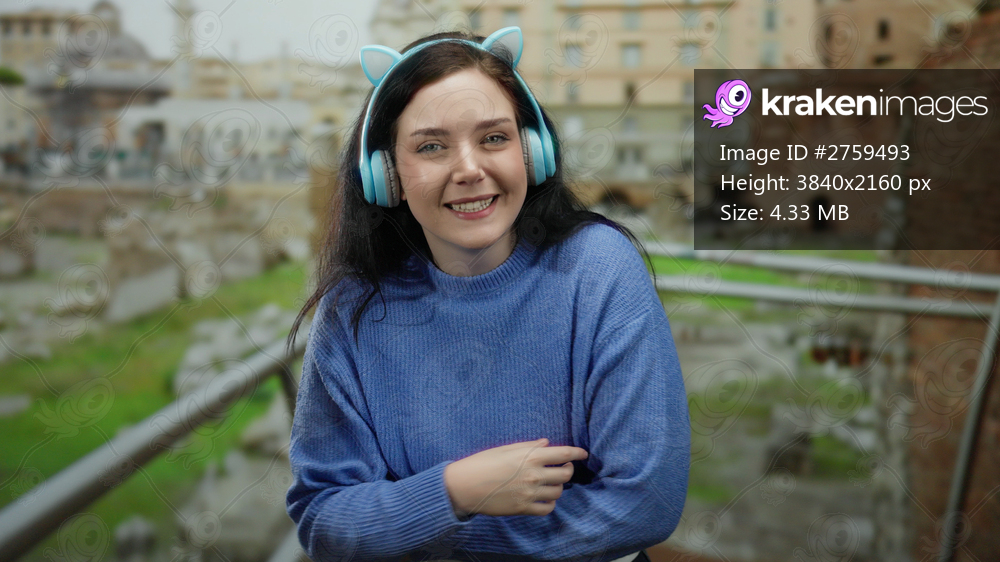 Brunette woman with headphones smiling amid ancient roman ruins outdoors, exuding beauty and serenity in a picturesque historical setting.